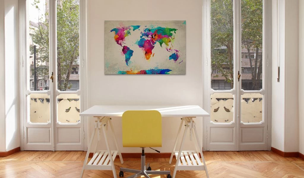 Afbeelding op kurk “Afbeelding op kurk – An Explosion of Colors [Cork Map]” is veel lichter dan traditionele wanddecoratie. Zo kunnen prikborden worden opgehangen op iedere willekeurige plaats thuis of op kantoor. Het bedrukte doek wordt aangebracht op de kurkplaat. Zo krijgt de print duidelijke kleuren en geeft het de kleinste details weer. Prik er punaises of notities in en creëer zo je individuele ontwerp op de muur!