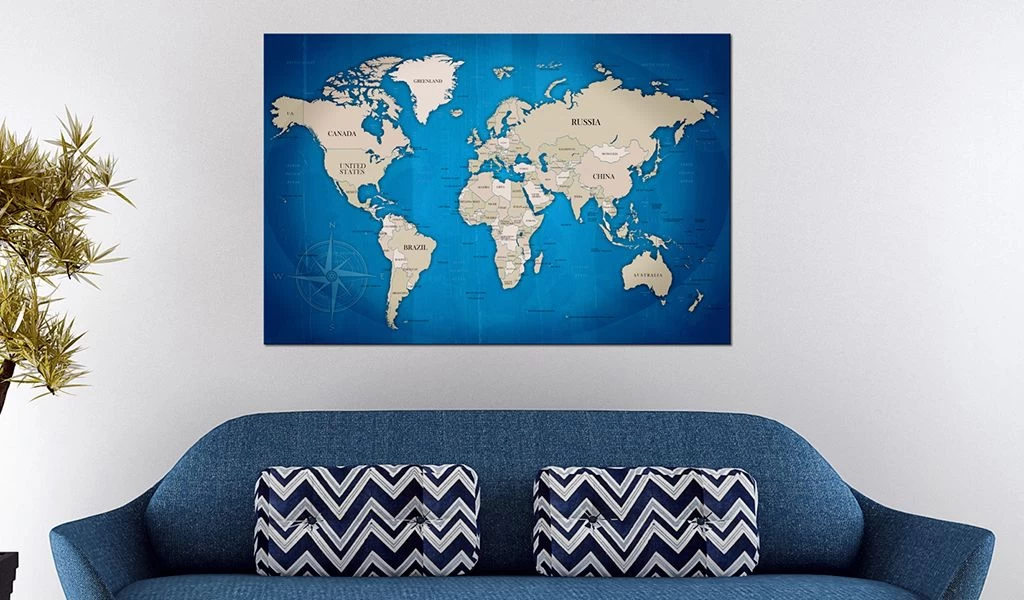 Afbeelding op kurk “Afbeelding op kurk – Dark Blue Trail [Cork Map]” is veel lichter dan traditionele wanddecoratie. Zo kunnen prikborden worden opgehangen op iedere willekeurige plaats thuis of op kantoor. Het bedrukte doek wordt aangebracht op de kurkplaat. Zo krijgt de print duidelijke kleuren en geeft het de kleinste details weer. Prik er punaises of notities in en creëer zo je individuele ontwerp op de muur!