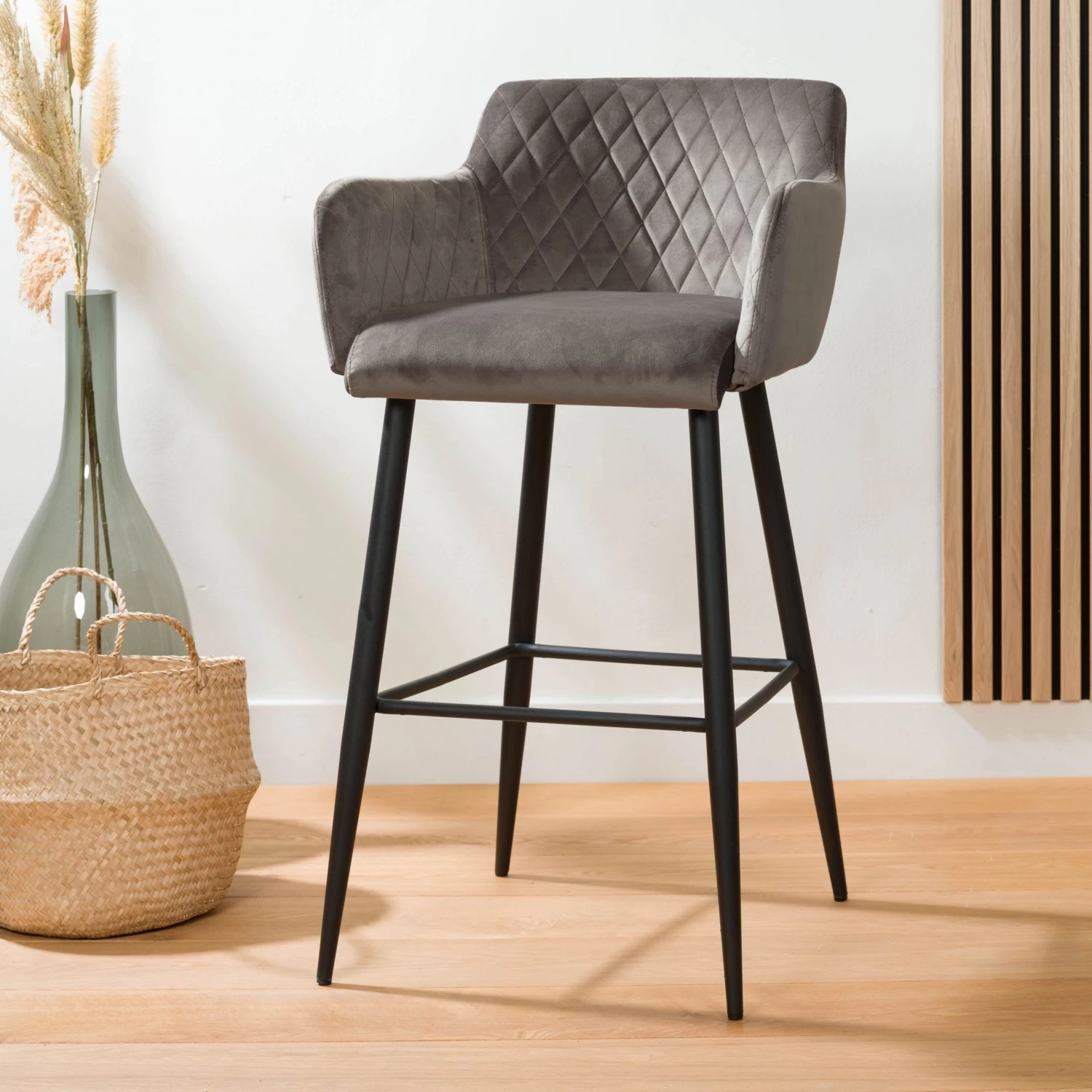 Rose barkruk velvet GrijsEen barkruk met benenDe Rose-barkruk is eigenlijk te mooi om ‘kruk’ te noemen. Dit is feitelijk een luxe stoel op hoge poten. Of moeten we ‘benen’ zeggen? Hoe dan ook: met dit edele zitmeubel gooi je zeker hoge ogen!Oogstrelend en comfortabelJe zit als een prins of prinses op deze barkruk. Hij combineert namelijk het luxueuze van onze geliefde Rose-stoel met het gemak van een barkruk. Je pakt hem moeiteloos op en zet ‘m daar waar hij nodig is, zoals je ook met een gewone barkruk zou doen. Maar zodra je erop gaat zitten ervaar je een ongekende mate van comfort. Steun aan de zijkanten en en de achterkant, en bekleed met oogstrelend fluweel, dat ook nog eens heerlijk aanvoelt. De dikke vulling in het zitgedeelte zorgt nog eens voor extra gerief. Een genot om naar te kijken én om te gebruiken, dus.Ideaal voor zowel huisbar als horecaHet ruitpatroon op de binnenkant van de leuningen geeft deze barkruk een klassieke uitstraling. Ideaal om rond een hoge tafel te zetten. Of bij een knusse huisbar. Maar ook in de horeca zou hij het geweldig doen. Immers: klanten die lekker zitten, blijven langer en bestellen meer! Daarnaast is de hoogte van 65 cm perfect voor aan, bij en onder de meeste gangbare tafels en togen. Tevredenheid gegarandeerd!Rank maar sterkDe Rose-barkruk mag dan rank ogen met zijn hoge benen, maar hij is oersterk. Hij kan maar liefst 150 kilo dragen. Makkelijk in elkaar te zetten is hij trouwens ook. Geen moeilijk gedoe: een paar schroefjes aandraaien en hij staat. En dan staat hij ook goed. Reinigen is geen probleem. Voor de zekerheid kun je bij ons een spray of schoonmaakset bestellen om de stof in tiptop conditie te houden. Mooie dingen wil je goed verzorgen, toch?Kenmerken Rose-barkruk