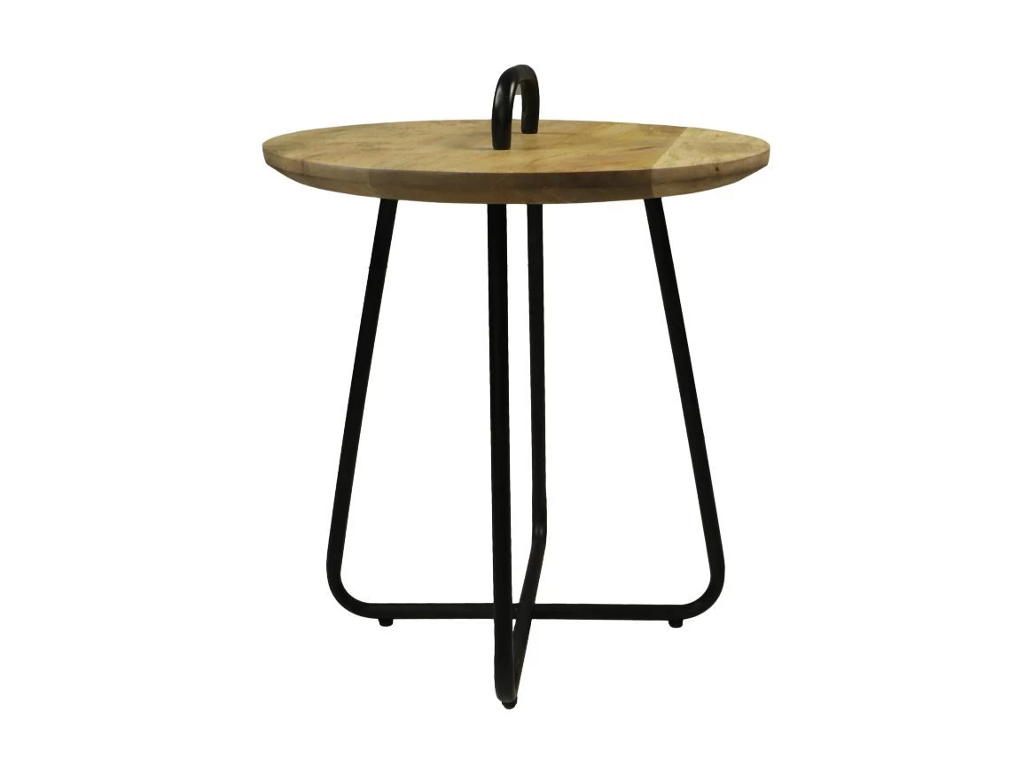 Deze bijzettafel is gemaakt van mangohout en heeft een zwart ijzeren frame. Met de metalen handgreep die op het tafelblad is bevestigd, kan de tafel eenvoudig verplaatst worden. Dit bijzettafeltje heefteen licht gewicht en is mede door het handvat