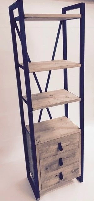 Boekenkast industrieel small met lades van gebruikt metaal en old look hout! Unieke boekenkast small met lades van gebruikt metaal en old look hout. Deze kast is ook zeer goed te gebruiken als muurkast of als room devider. De lades zijn voorzien van een leren greepje!