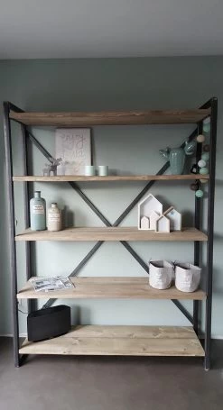 Een unieke open industriële boekenkast gemaakt van gebruikt metaal en old look hout. De industriele boekenkast is ook zeer goed te gebruiken als wandmeubel of als roomdivider. Bestel je deze kast? Alle kasten zijn uniek. De kleuren kunnen licht afwijken van de foto.