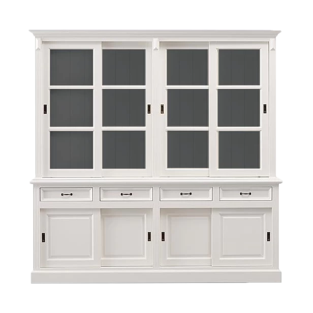 Deze indrukwekkende buffetkast van De Kistenkoning is een tijdloos meubel waarmee je echt iets toevoegt aan je woon- of eetkamer. De kast bestaat uit een bovendeel met glazen schuifdeuren die soepel openglijden, subtiele lades en houten deuren aan de onderkant. Kortom: genoeg ruimte om al je spullen in op te bergen, die er door de witte achtergrond mooi uitspringen. Het geheel heeft een landelijke uitstraling en creëert rust in het huis. Verkrijgbaar in vele kleuren en maten, dus ook zeker één die aansluit op jouw wensen!