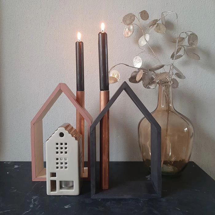 De Copper House wordt gemaakt van 1cm dik berkenhout. De kandelaar is gemaakt van koper, dit geeft een luxe uitstraling en maakt jouw kerstdorp compleet. De afmetingen van het huisje zijn 25x15x7 cm. De Copper House is verkrijgbaar in verschillende kleuren: blank, zwart, dip dye terracotta, en rondom geverfd in oudroze. Excl. kaars