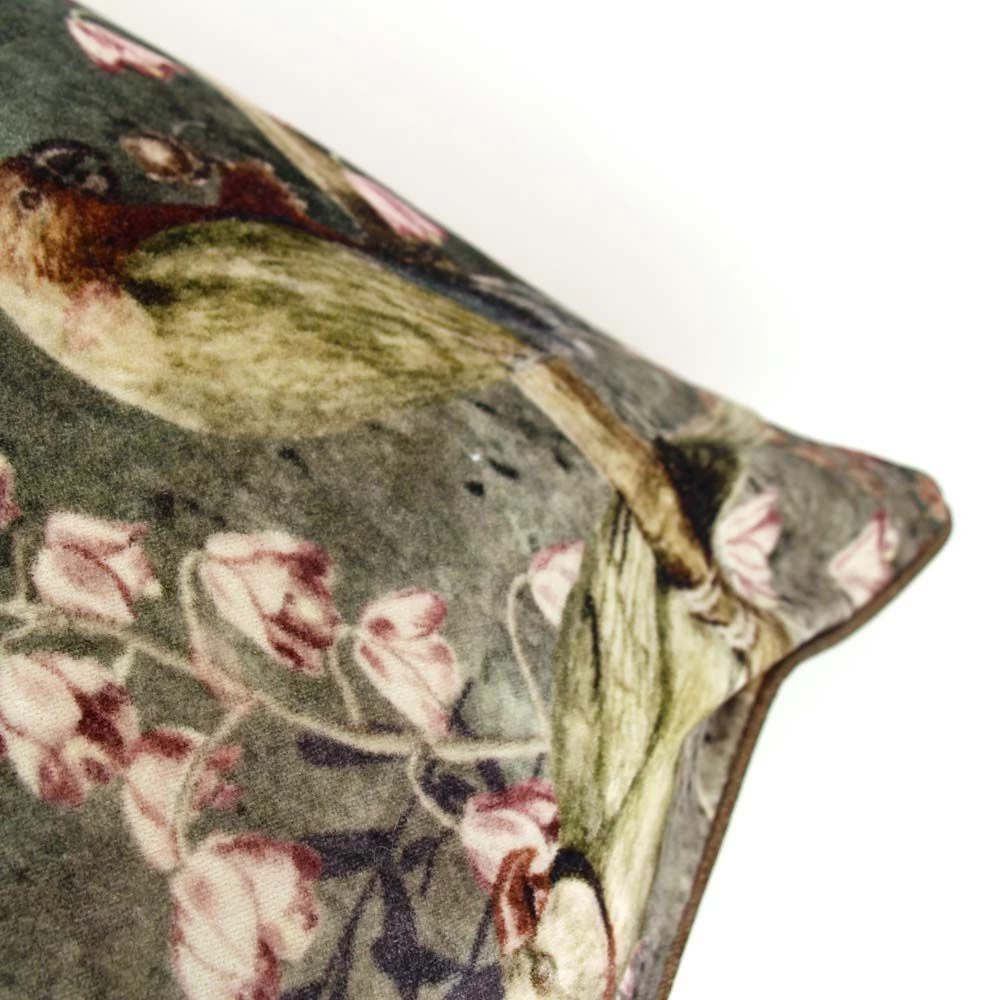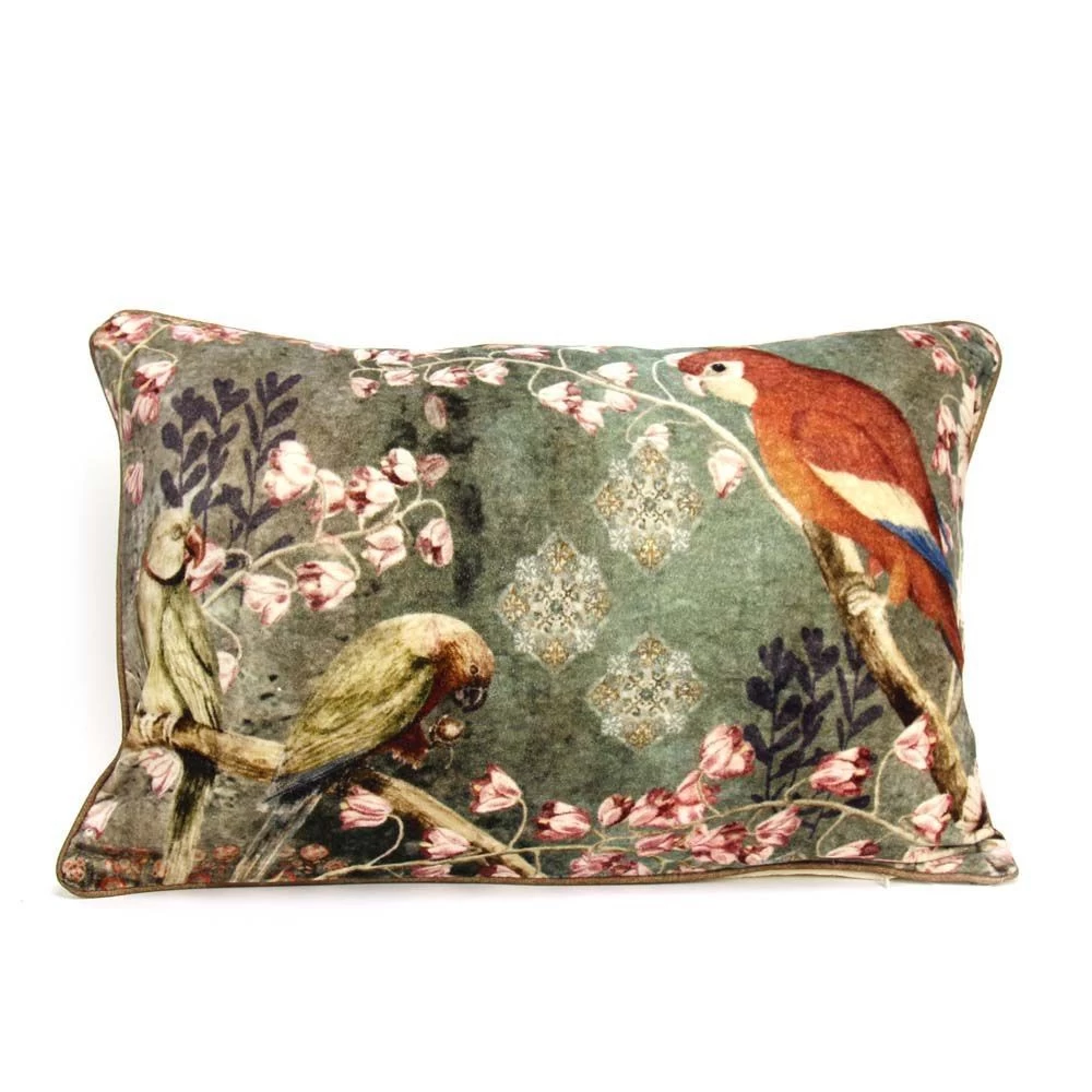 Dit kussen met vogels uit de jungle heeft een exotische uitstraling. Als je naar dit kussen kijkt, krijg je zin in vakantie! Leg het kussen in een stoel of op je bank. Haal de natuur in huis. We houden van zijn fluweelzachte gevoel. Onze tip: kies rotan meubels en maak de tropische sfeer compleet!