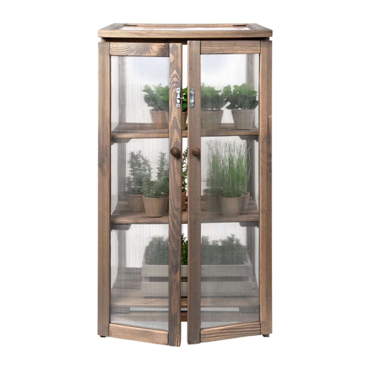 Deze kas is voorzien van polycarbonaat ramen en heeft drie schappen. De polycarbonaat ramen verstrooien het licjt waardoor planten niet (snel) verbranden. Het dak van de kas kan worden geopend voor een extra “boost” zonlicht.