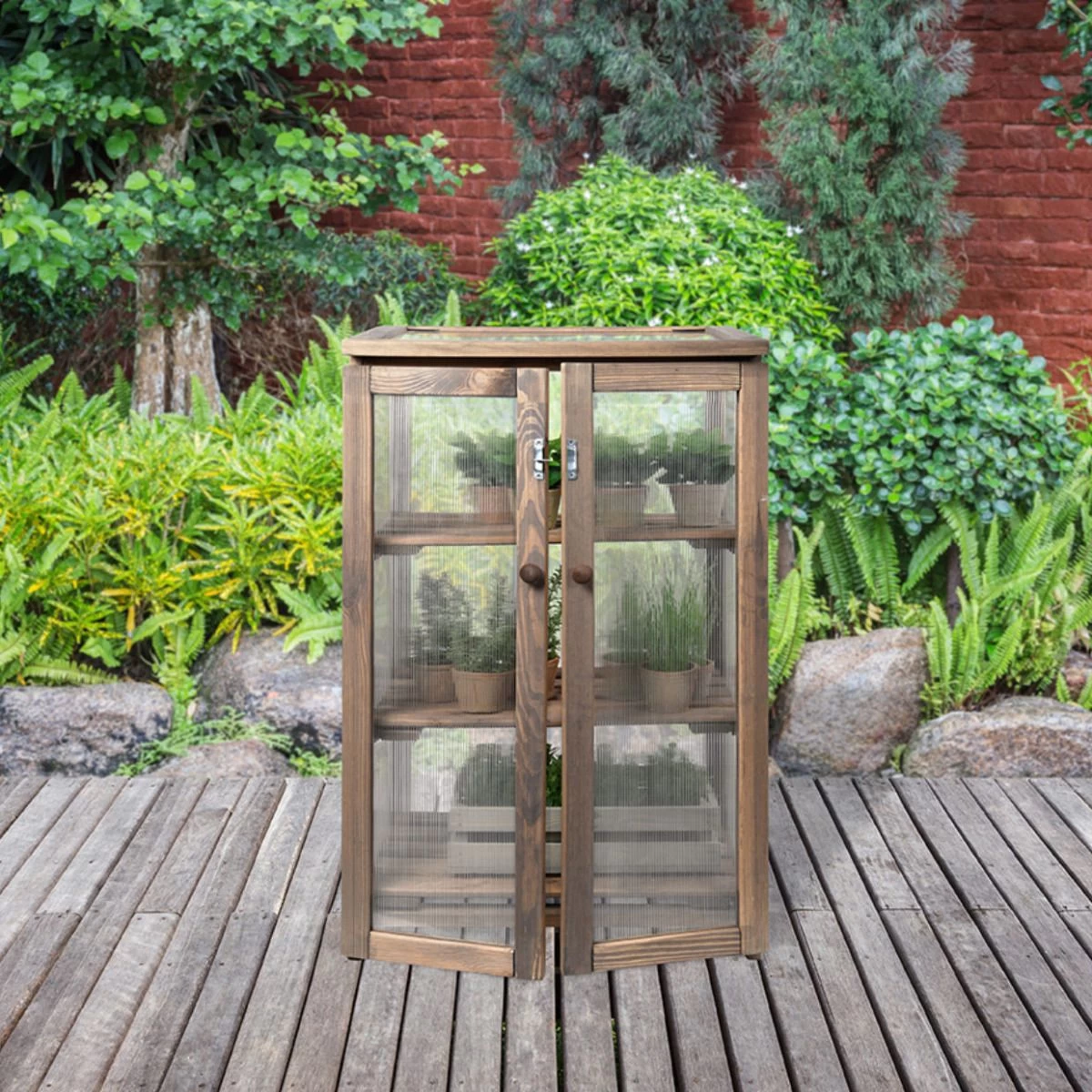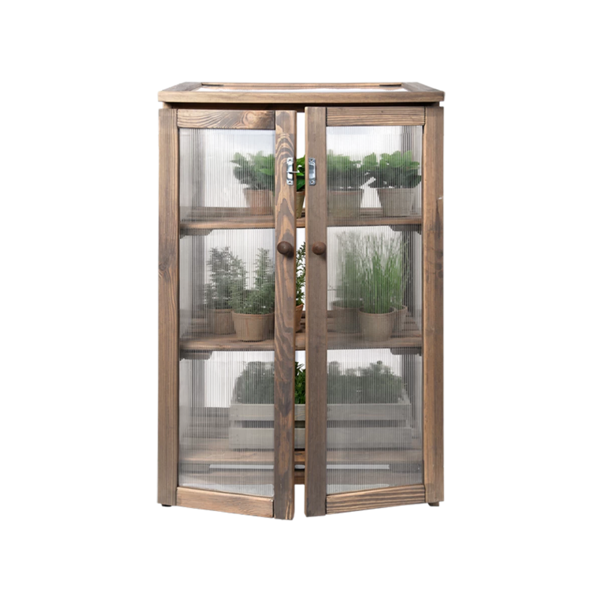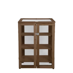 Deze kas is voorzien van polycarbonaat ramen en heeft twee schappen. De polycarbonaat ramen verstrooien het licht waardoor planten niet (snel) verbranden. Het dak van de kas kan worden geopend voor een extra “boost” zonlicht.