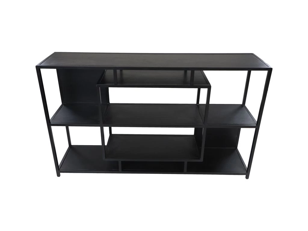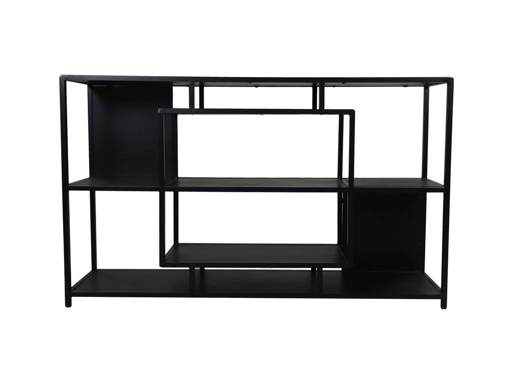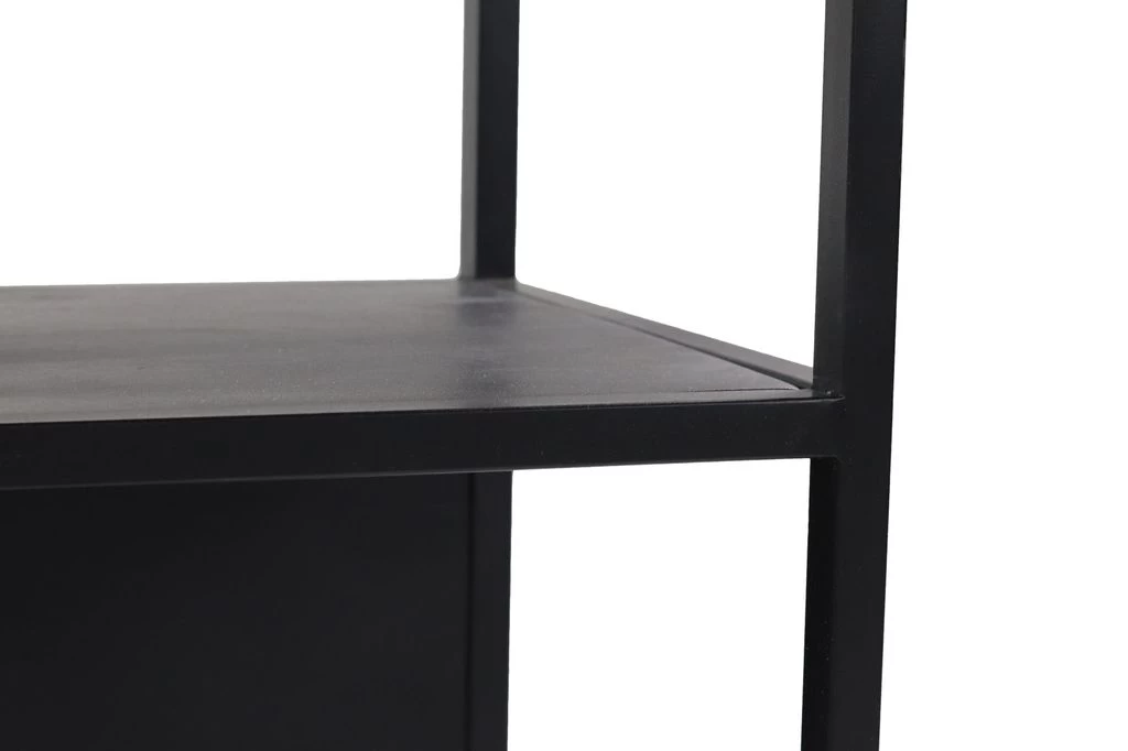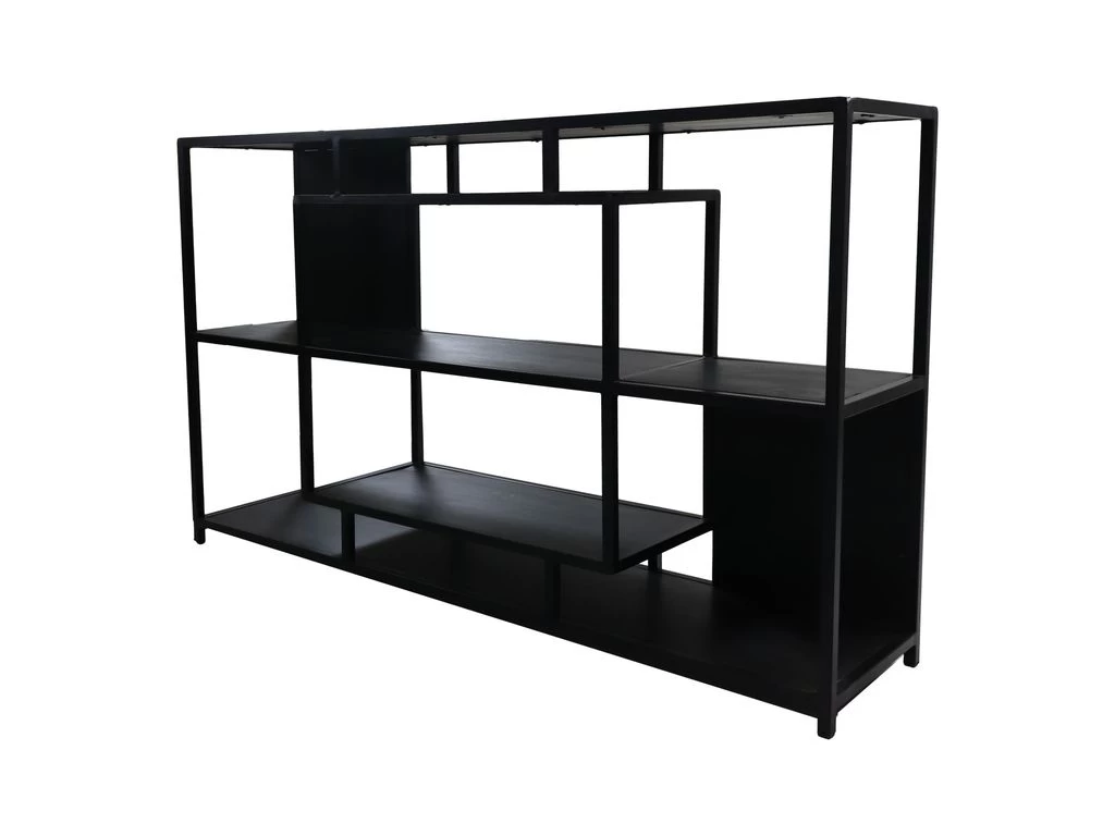 In de open vakkenkast van HSM Collection kan je je mooiste accessoires tentoonstellen. Het dressoir met speelse indeling en strakke lijnen is gemaakt van zwart metaal en heeft legplanken van mangohout. Het mangohout heeft een zwarte afwerking. Het dressoi
