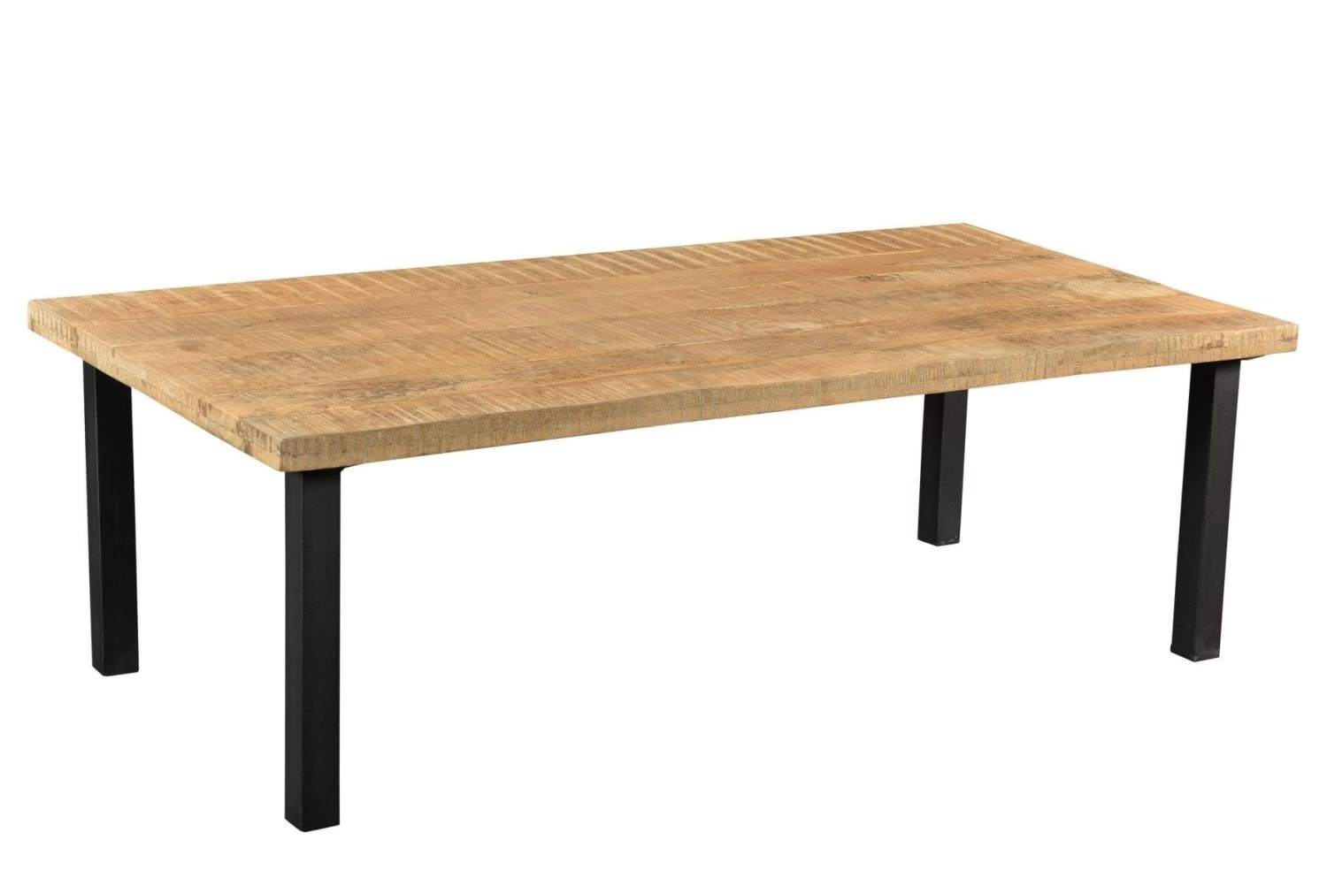 Deze unieke salontafel is erg populair! De salontafel bestaat uit een blad van natuurlijk mangohout en metalen poten met een natuurlijk zwarte lak kleur. De salontafel is stabiel en wiebelt niet. Deze salontafel past heel goed in een industriële woonstijl, maar ook in andere woonstijlen komt de salontafel van pas. Voldoende ruimte voor tijdschriften, de afstandsbediening of andere accessoires. De salontafel is verpakt in eén doos, uitpakken en klaar voor gebruik!