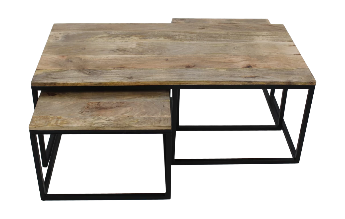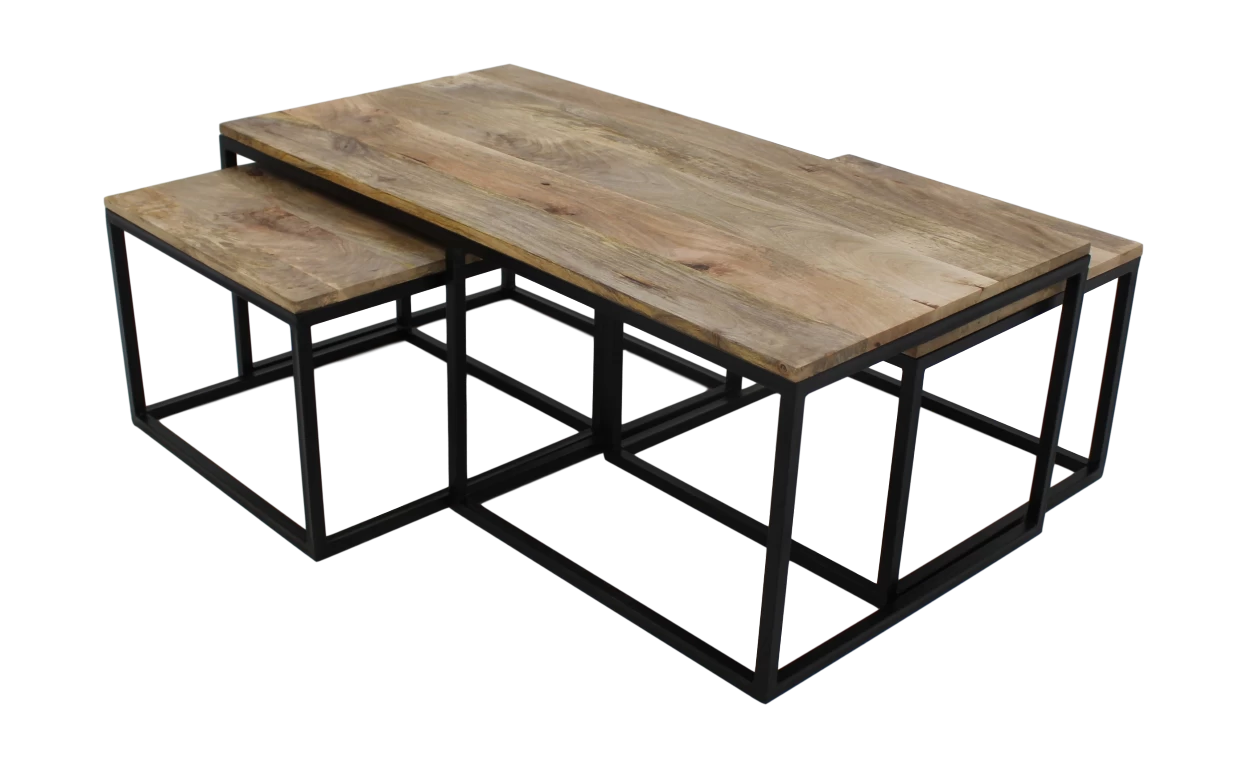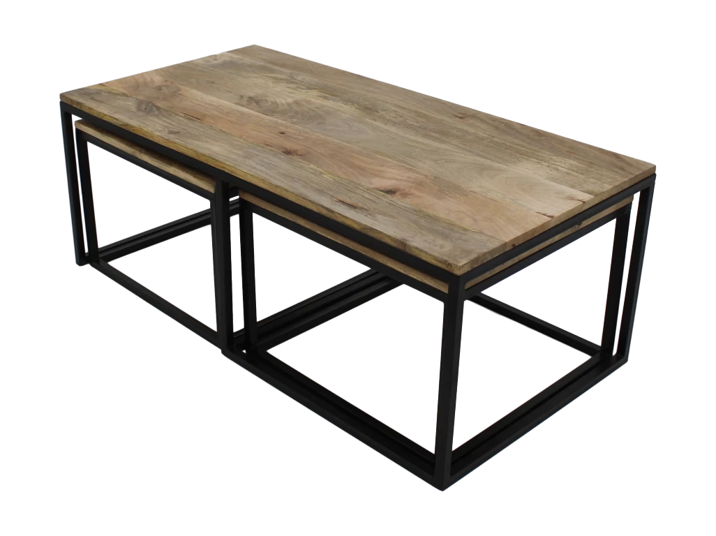 Deze unieke salontafel van HSM Collection bestaat uit 1 grote salontafel en 2 kleine bijzettafeltjes. De salontafels zijn vervaardigd uit mangohout en hebben een robuust ijzeren onderstel. De tafels kunnen in elkaar worden geschoven zodat ze, als ze niet