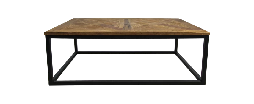het robuuste houten tafelblad met mozaïekpatroon en metalen onderstel geven de tafel een stoere industriële look.