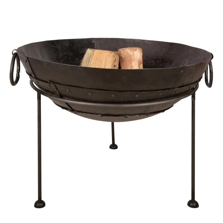 “Gerecycled” metalen vuurschaal maat L. Doordat deze vuurschaal met de hand is vervaardigd uit staal van oude vaten en autowrakken is iedere schaal uniek. Voorzien van handgrepen en standaard.